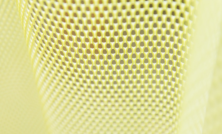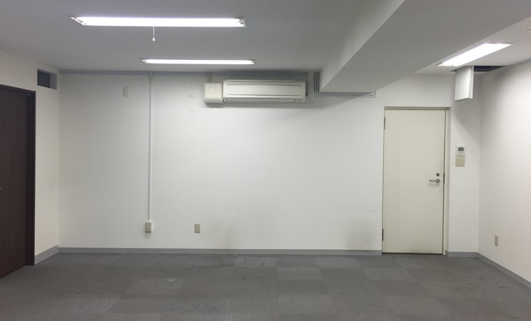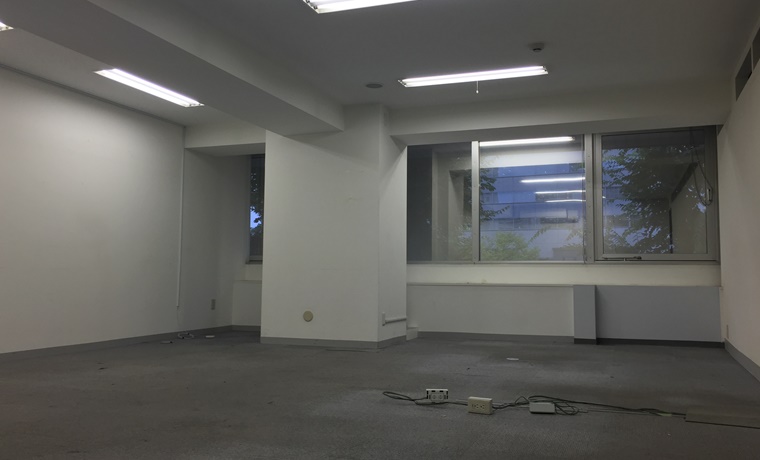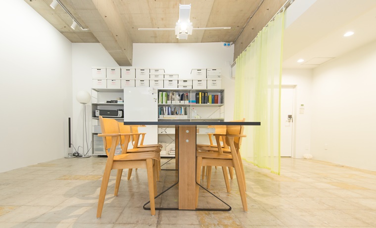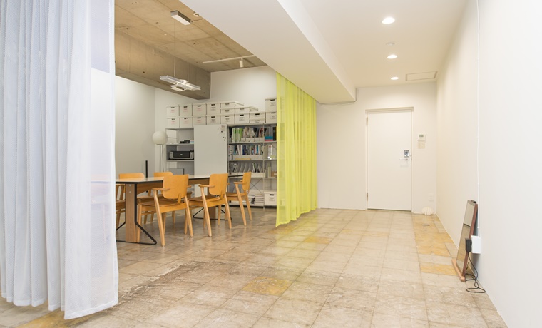 多目的スペース・執務スペース・廊下の間仕切りはメッシュのカーテンとした。広く使用したい場合は開放、集中したミーティングをおこなう場合は閉鎖できる。カーテンを全て閉め切ってもメッシュで透過性が高く、圧迫感はない。素材を活かしたシンプルな色合いを基調とするこの室内で、淡い黄色いカーテンをアクセントにした。