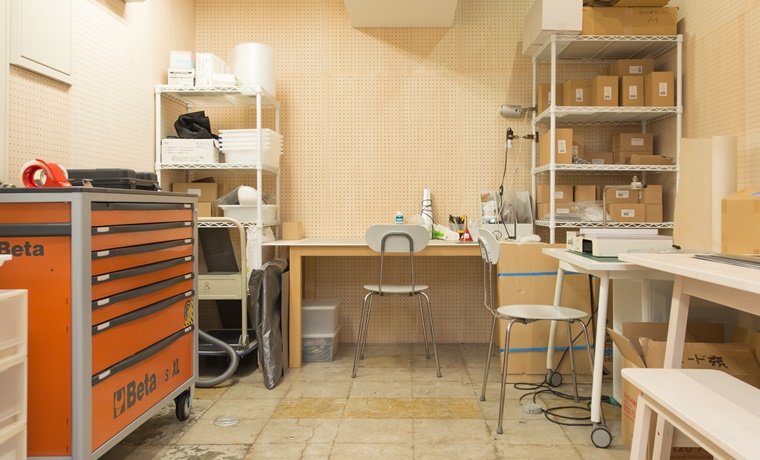 奥にあるものづくりのための空間は工房となっている。有効ボードを張りめぐらせ、棚やフックなどの追加などの拡張性を持たせるなど使い勝手にも配慮した。